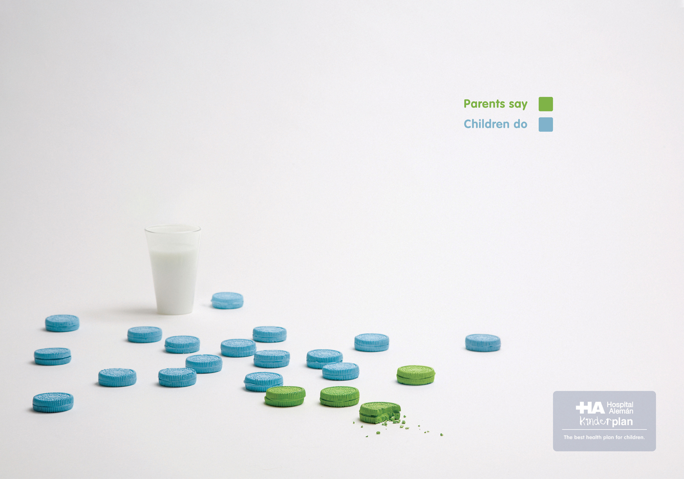阿雷曼Aleman儿童医院宣传广告-绿色是父母说的,蓝色是孩子做的,这就是最好的儿童保健计划。3