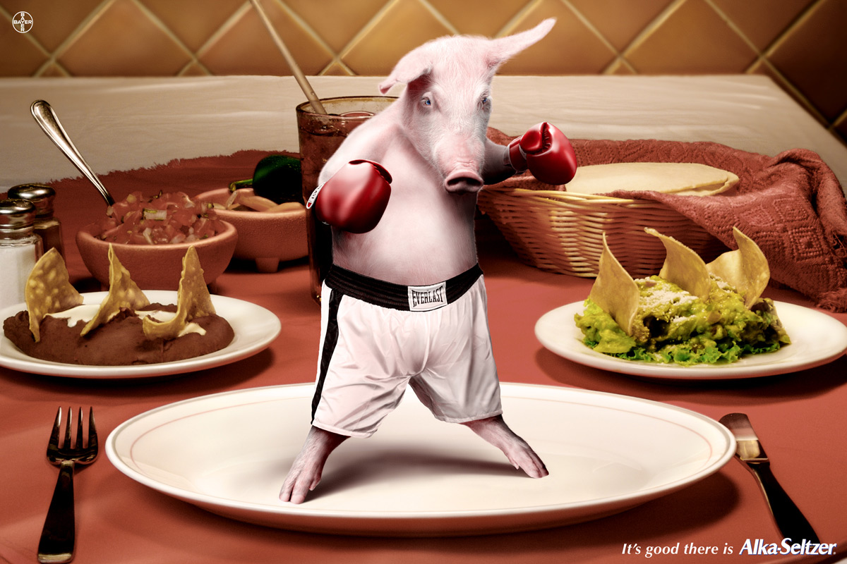 Alka Seltzer 消食片的广告-牛肉、鸡肉、猪肉全上来吧,我都不怕。2