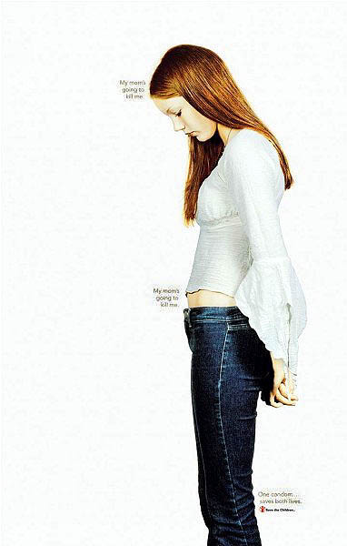 拯救儿童组织关于少女早孕公益广告-上:我妈妈会杀了我。中:我妈妈会杀了我。下:一个避孕套...保住两条命。