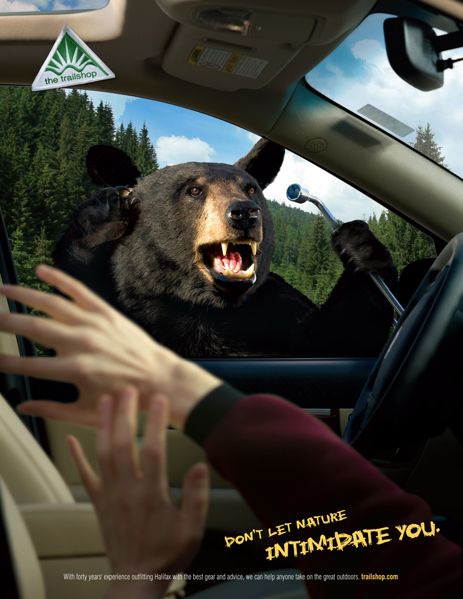 Trailshop户外用品商店的宣传广告-不要害怕,在户外我们可以助你一臂之力。Bear