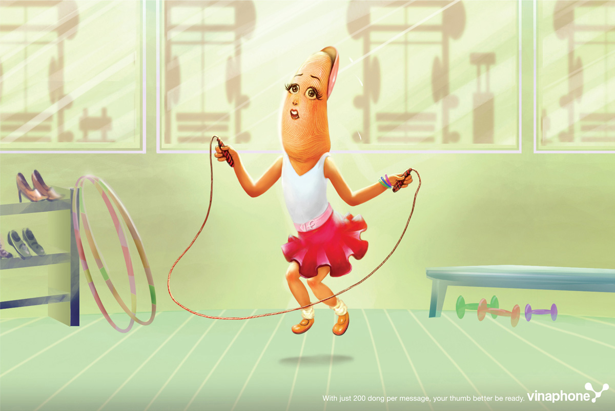 越南移动通信公司Vinaphone的宣传广告-母指们需要多运动,这样才好玩短信,大慨是这个意思吧。, 2